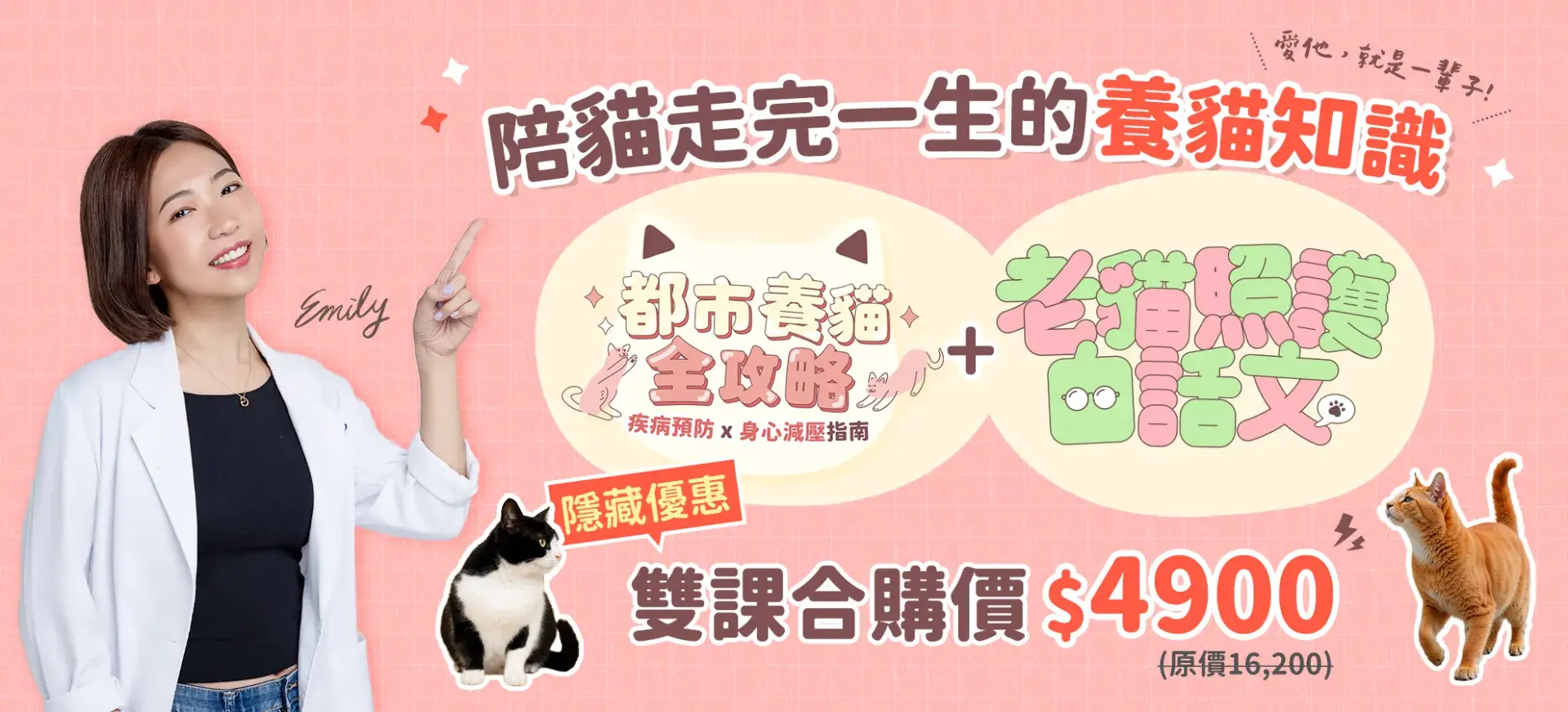 在這套課程當中,你會學到: ❶ 從幼貓開始的關鍵照護知識 ❷ 人與貓如何和諧共處,達成平衡 ❸ 健檢報告怎麼看,如何讓牠健康 ❹ 7歲以後的進階照護技巧 ❺ 疫苗、口腔健康、梳毛等詳細做法